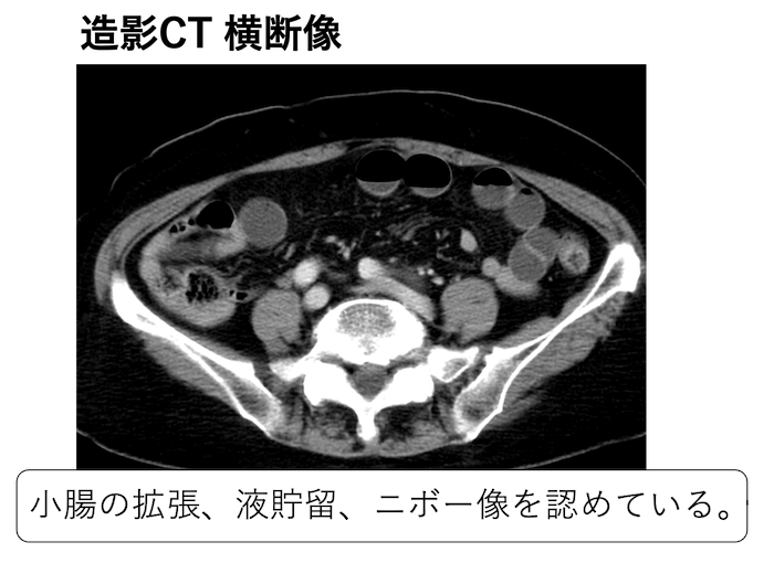 【身体所見】意識清明、下腹部正中に手術痕あり、その部位に一致して圧痛と反跳痛あり。腸蠕動音は亢進。