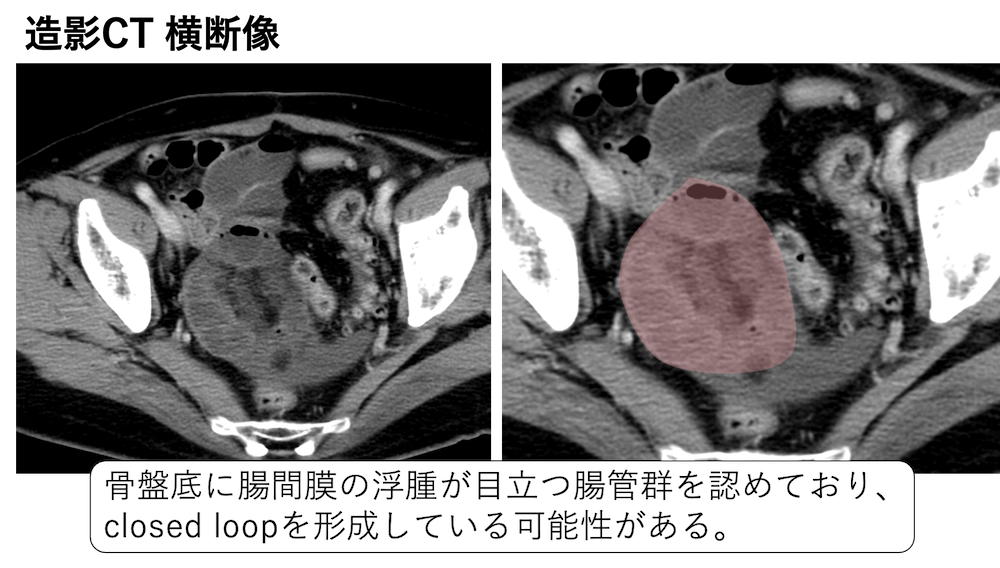 骨盤底に腸間膜の浮腫が目立つ腸管群を認めており、closed loopを形成している可能性があります。