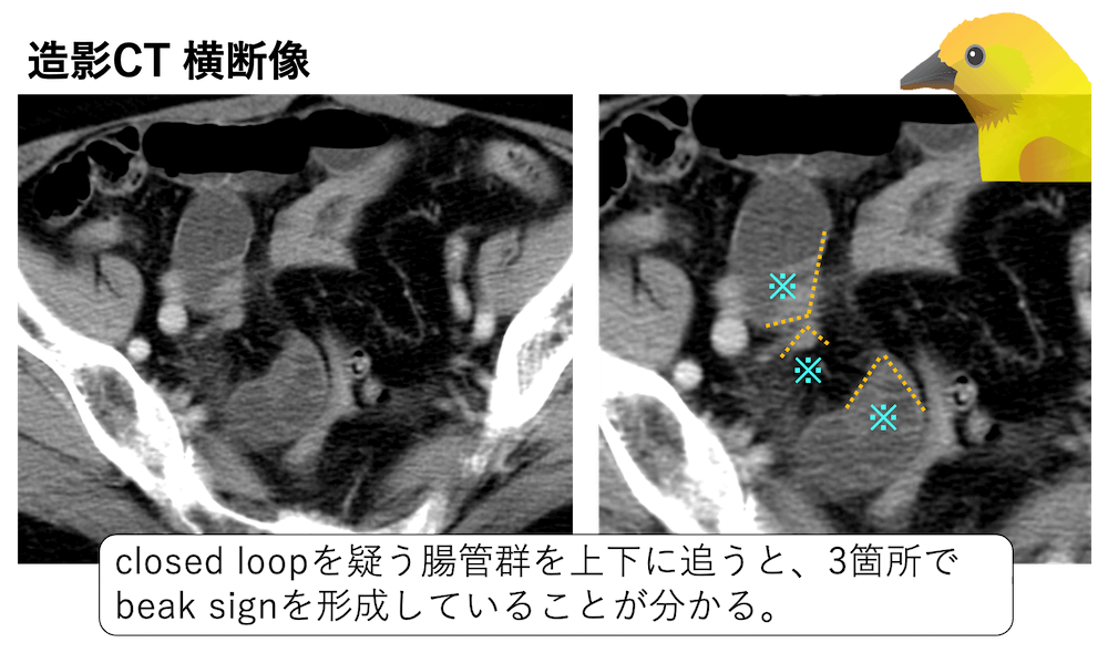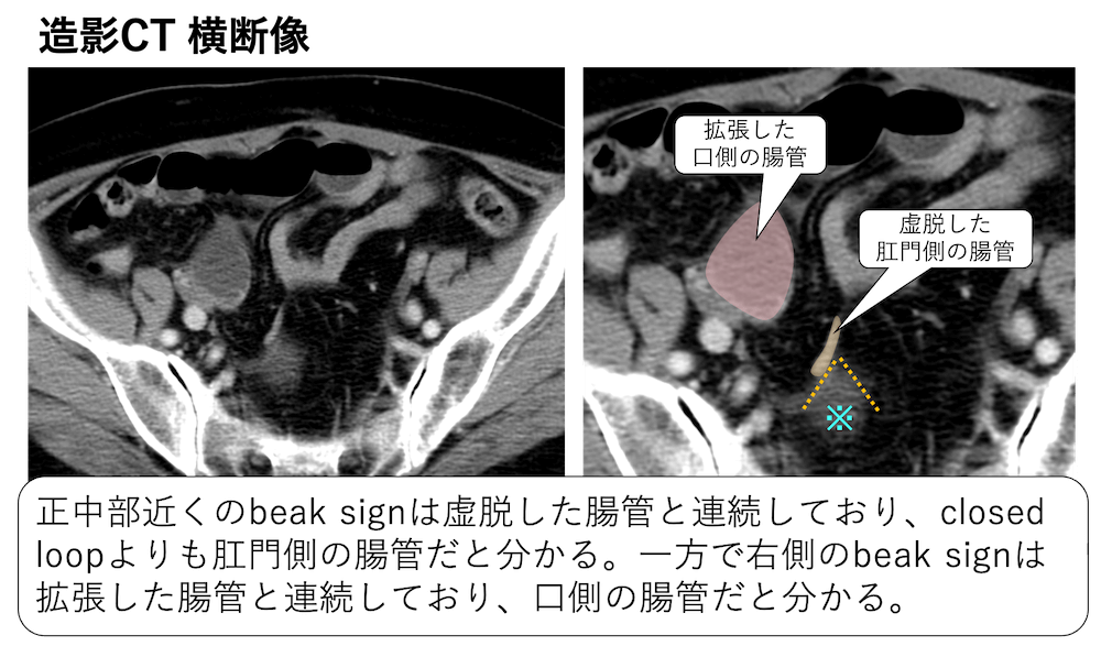 正中部近くのbeak signは虚脱した腸管と連続しており、closed loopよりも肛門側の腸管だと分かります。一方で右側のbeak signは拡張した腸管と連続しており、口側の腸管だと分かります。