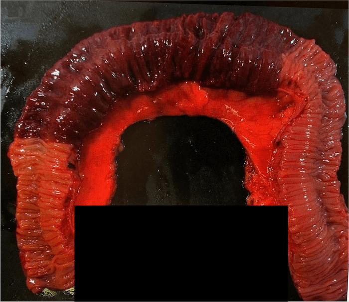 CT上は明らかな造影不良は認めませんでしたが、壊死に陥っており、腸切除が行われました。