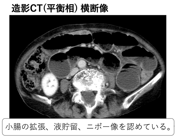 小腸の拡張、液貯留、ニボー像を認めています。