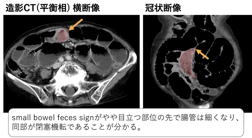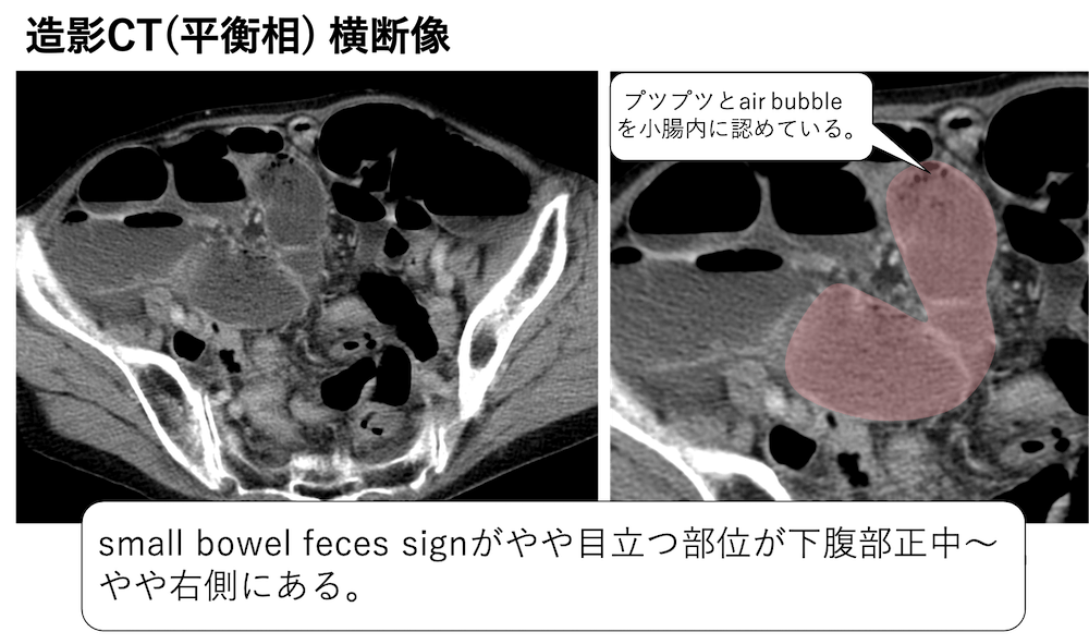 食道内などから認めている残渣のような構造を認めているため、ちょっと分かりにくいかもしれませんが、small bowel feces signがやや目立つ部位が下腹部正中〜やや右側にあることがわかります。