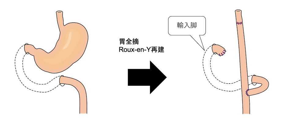 胃全摘後のRoux-en-Y再建は以下の通りです。