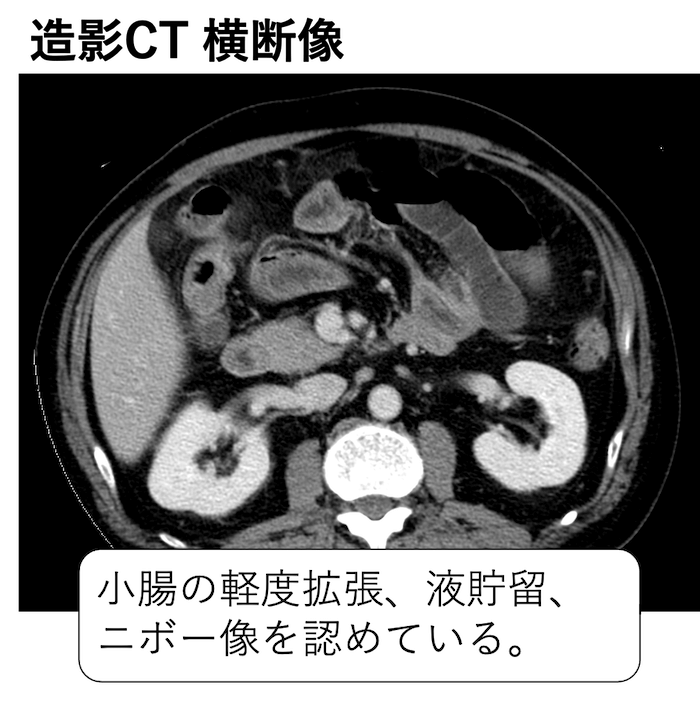 小腸の軽度拡張、液貯留、ニボー像を認めています。