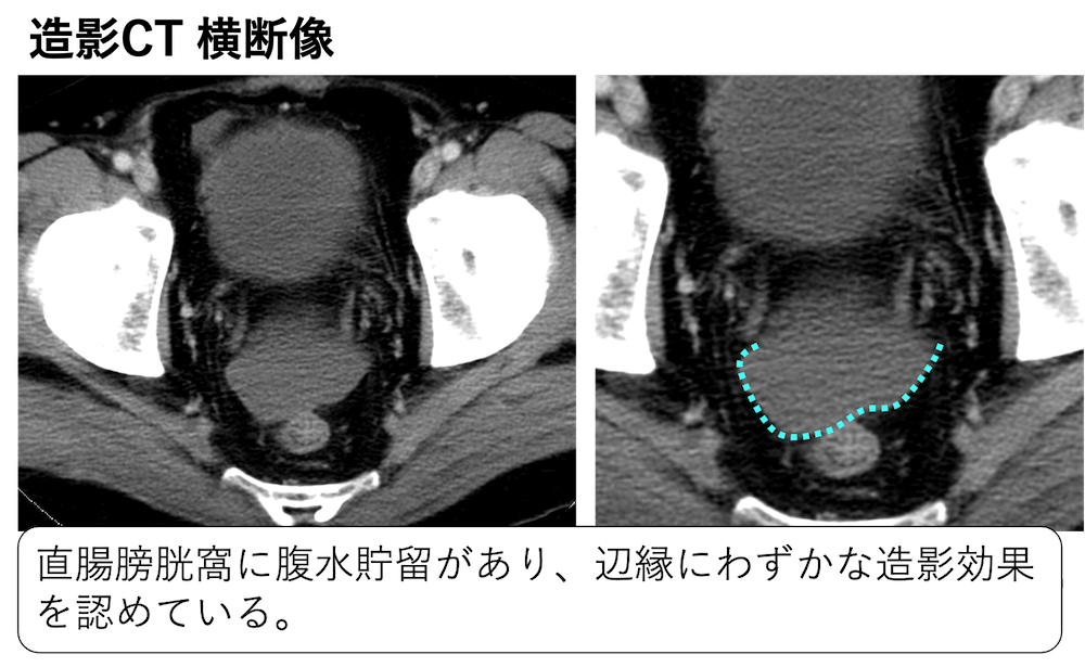 直腸膀胱窩(Douglas窩)に腹水を認めていますが、辺縁にわずかに造影効果を認めています。