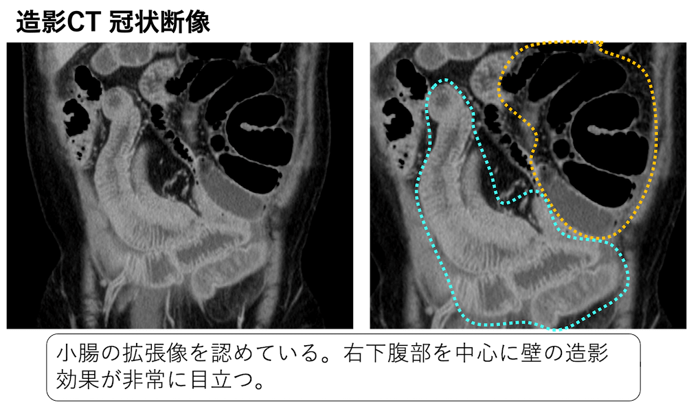 一方で、右下腹部を中心に、壁の造影効果が著明に目立ちます。粘膜側もですが、漿膜側にも造影効果があるように見えます。