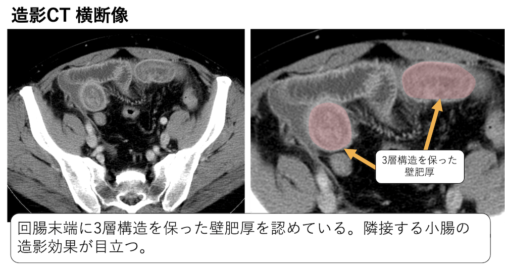 下腹部を見ると、回腸末端に3層構造を保った壁肥厚像を認めています。