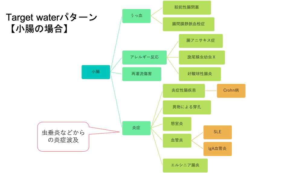 小腸の3層構造を保った壁肥厚、すなわり、target water パターンを見た際には以下の様な疾患を考えなければならないのでした。