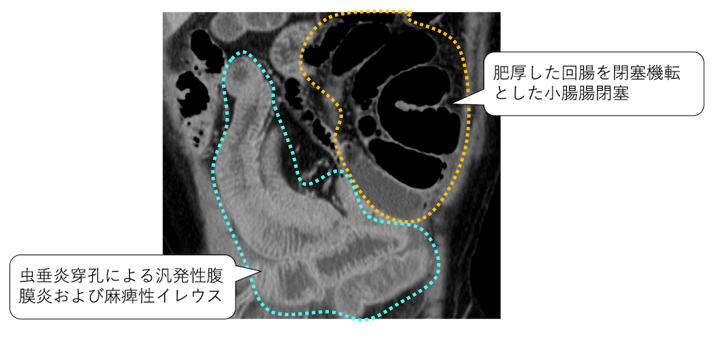診断:虫垂炎穿孔による汎発性腹膜炎疑い(およびそれに伴う麻痺性イレウス、および回腸への炎症波及による壁肥厚を閉塞機転とした小腸腸閉塞)