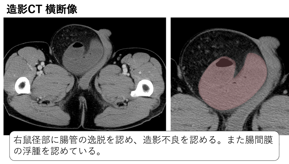 右鼠径部に腸管の逸脱を認め、造影不良を認めています。