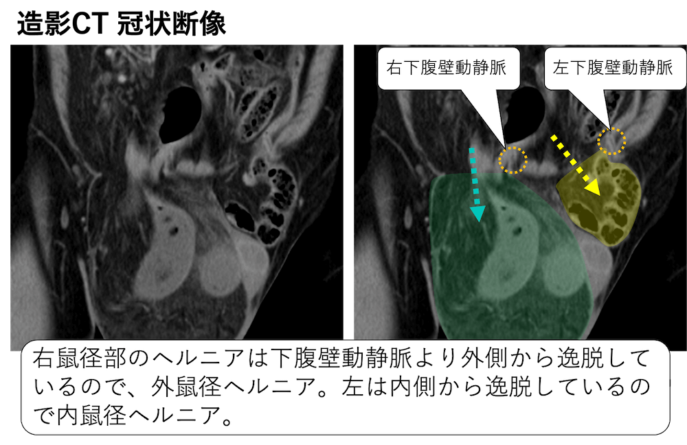 左は内側から逸脱しているので内鼠径ヘルニアと診断できます。